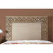 There's something about a tall headboard that just adds class to a bedroom. The combination of a foam padded fabric and carved x-shaped details plays with contrasting textures for a beautiful visual backdrop. The matching case goods feature matching carved drawer faces with dark square hardware that stands out against the weathered light oak finish. This bedroom set combines a touch of rustic wood with contemporary wood carving and fabric, allowing it to match any design direction you take.
