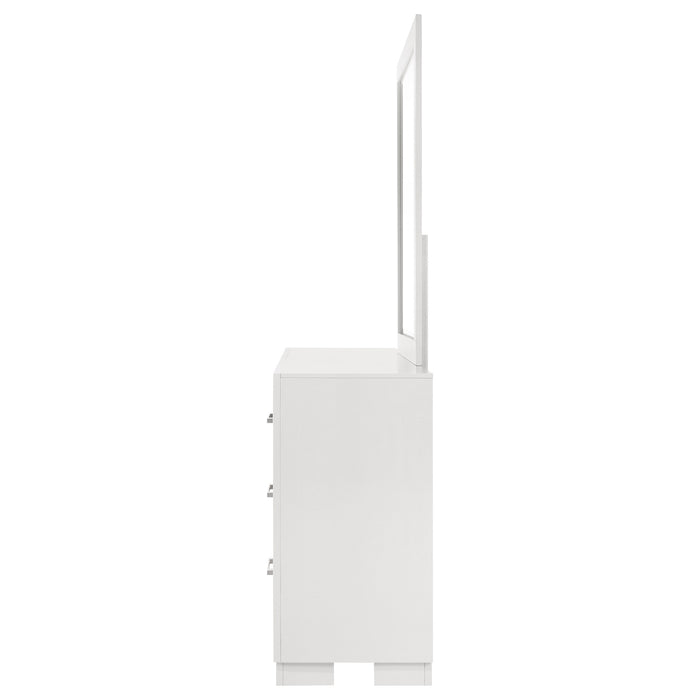 Elegant simplicity defines this dresser and mirror set, offering balance between refined design and everyday function. The six-drawer dresser provides generous storage, while the coordinating beveled mirror brings light and dimension to the room. Sleek bar pulls complement the sturdy wooden construction, creating a harmonious blend of practicality and sophistication. Perfect for modern bedrooms, this pairing completes the space with enduring grace and quiet elegance._x005F_x000D_ Key Features: • Six-drawer dresser and mirror set designed with crisp modern geometry • Snow white finish brightens and refreshes the surrounding space • Coordinating beveled mirror adds dimension and refined contrast • Felt-lined top drawers cradle keepsakes and delicate accessories • Silver-tone bar pulls highlight the sleek and graceful silhouette • Rubberwood and engineered construction ensures lasting durability