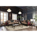 Quirino Burgundy/Dark Brown Sofa, 93"L X 38"W X 42"H, 180lbs. For a traditional set, this sofa and love seat pair has a few surprises. The seat features a distinct two-tone back with tufted leatherette breaking up the beautifully-patterned fabric. A contrasting welt spices up the otherwise standard, single seat cushion. An intricately carved wooden trim frames the rolling arms and a shaped crest plaque the skirt and backing emphasize the sophistication of this collection. Features: Traditional Burgundy/Dark Brown Chenille, Leatherette, Solid Wood Frame Intricate Wood Trim Rolled Arms High-Density Foam Cushions Loose Back Pillows Pillows Included