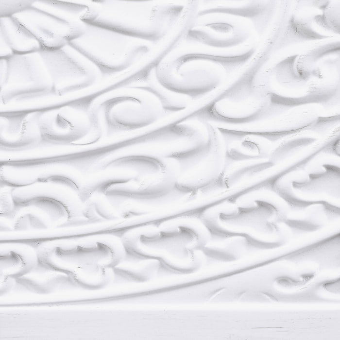 Put the last touches on a stylish space with the added storage and impeccable style of a modern accent cabinet. Featuring two decorative magnetic push-to-open doors, it's the perfect addition in any space, offering ample interior space with an adjustable shelf. The top creates space for decor or to highlight beautiful artwork hung above. The cabinet boasts a crisp white finish, bringing light, refined character to a pair of floral medallion doors. Curvy legs feature silver-toned caps, adding a hint of contrast and dimensionality in any room. Key Features: • Bold medallion doors highlight a modern two-door accent cabinet with stylish allure • Cool white finish is bright and airy, perfect for an entry, living area, or bedroom • Magnetic push-to-open doors feature carved floral medallions that bridge the gap between traditional and contemporary • Offers easy, stylish storage with an adjustable interior shelf that's great for any room • Curvy turned legs feature metal ferrules that add a touch of gleaming appeal