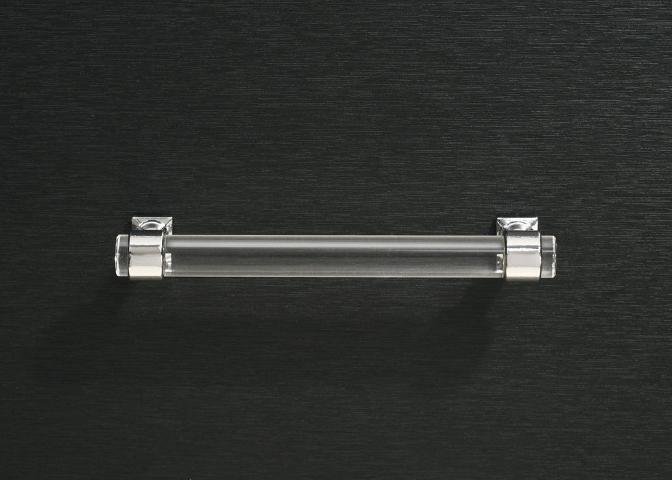 Gleaming chrome trim captures attention on a modern two-drawer nightstand. Perfect for your sophisticated bedside, it boasts a bold black finish case that offers the perfect touch of depth with its chrome trim. A pair of long bar pulls decorate drawer fronts. Hairpin style legs offer vintage flair and exceptional elegance. Two drawers add plentiful bedside storage, offering a place to ruck away personal items and overnight essentials. Key Features: • Chic touches bring glamour and elegant flair to a modern two-drawer nightstand • Bold black finish is crisp and clean in a sophisticated bedroom setting • Cool gleaming chrome finish trim highlights the front of the case, long bar pulls and decorative legs • Drawers add bedside storage to keep a tidy look and feel while ensuring necessities are in reach • Drawers includes English dovetail joinery that ensures utmost quality of construction