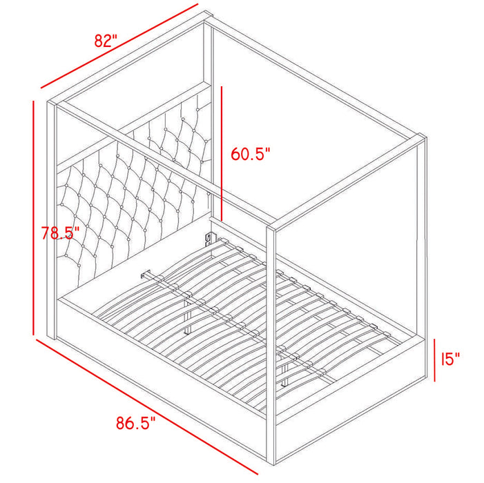 Dream big in the Porter green velvet canopy bed. This handsome Meridian Furniture bed has a tufted headboard that stands a full 60 inches tall, giving the bed a regal and sophisticated look. The headboard is tufted for added elegance, and the bed comes with a chrome canopy, adding to its overall elegance and grandeur. Green velvet fabric used on the sides and headboard gives it a luxe vibe, and the headboard is heavily padded, making it an ideal backrest for reading or watching TV.