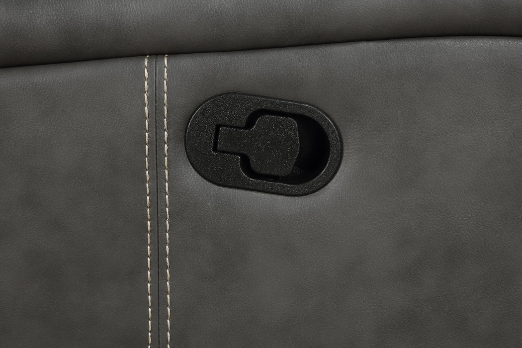 Blending modern and transitional design, this motion loveseat delivers both style and comfort. Upholstered in smooth grey leatherette, it features decorative vertical topstitching for visual dimension. Plush foam padding and pocket coil spring cushions provide supportive comfort, while ultra-padded headrests enhance relaxation. A wall-hugger reclining mechanism saves space, and a flip-top center console offers storage for remotes and essentials. Two built-in cup holders keep beverages within reach, making this loveseat perfect for everyday lounging._x005F_x000D_ Key Features: • Motion loveseat upholstered in smooth grey leatherette with vertical topstitching • Manual reclining seats offer customizable comfort for daily lounging needs • Wall-hugger mechanism allows reclining without taking up extra room space • Plush foam padding and pocket coil seating provide durable supportive comfort • Center console flips open to store remotes, magazines, and small accessories • Two built-in cup holders keep drinks within reach for movie nights or relaxing